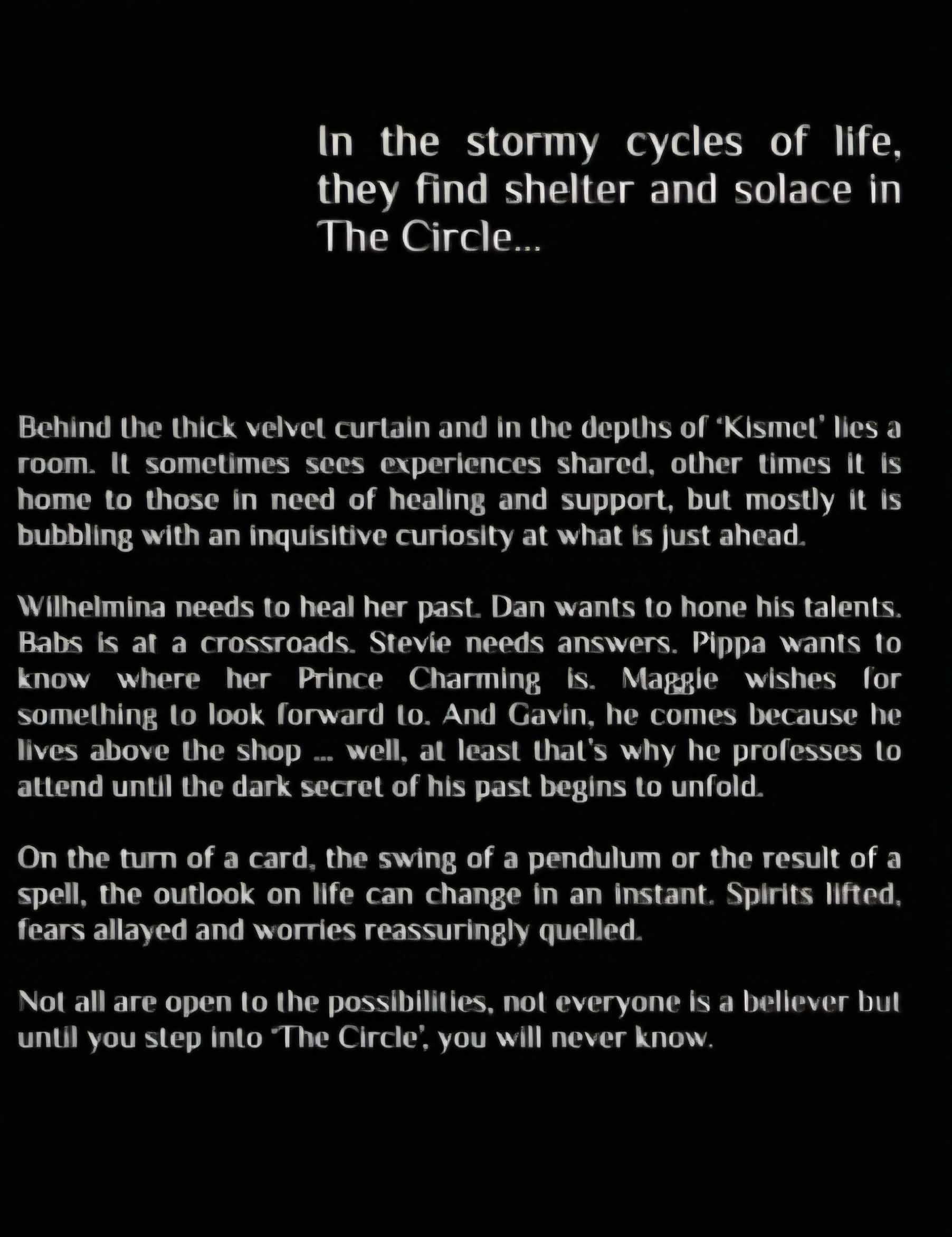 Tracey wrote 'The Circle' after a car accident left her immobilised and her doctor suggested writing as a therapeutic release. Having attended several psychic development circles over the years, the shop 'Kismet' and characters alike began to form and 'The Circle' was born. She has won prizes for poetry, writing and had short stories published in magazines. She currently lives with her parents and her son in the suburbs of East London, enjoys reading, gardening, crystals and learning about the world we live in, as well as the one beyond the veil.